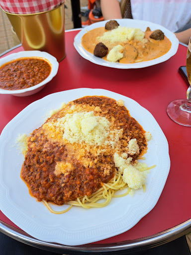 When after a while we decided to eat something, we ordered the spaghetti. The taste was good, but the portions were really small. You actually have to order additional sauce (at an additional cost) so that you would have eaten well. My girlfriend then opted for 3 extra balls, but they were so small and for 3 euros extra. A pity. Quite expensive for what you get. A one-time...