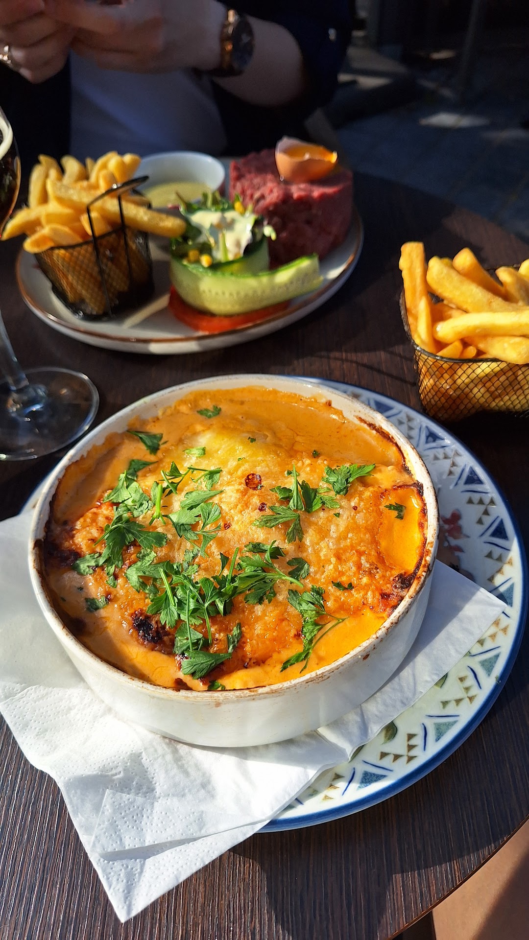 Delicious "Vispannetje" 😘 Nice and generous variety of seafood - prawns, salmon and some white fish (sea bass?) - in a very flavourful and creamy soup/sauce, with a nice crispy top layer of cheese! Service is ok, friendly but can get busy and distracted and forget your requests (e.g. mayonnaise for fries, receipt after payment). Outdoor seating can be a bit neater and cleaner. Really enjoyed the food, hope service and atmosphere improves :)