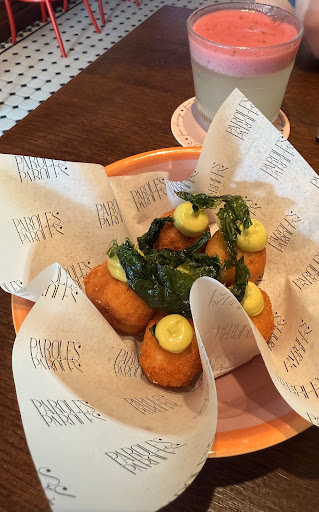 En wat is een diner zonder een zoete afsluiting? De Spaanse churros met dulce de leche waren de kers op de taart. Sinds mijn ontbijt in Peru ben ik verliefd op deze smeuïge lekkernij, en de churros van Paroles Paroles stelden zeker niet teleur. Perfect krokant van buiten en heerlijk zacht van binnen, met een rijke, romige dulce de leche die me nostalgisch maakte. Een heerlijk wijntje bij elk gerechtje en de avond kon niet meer stuk.