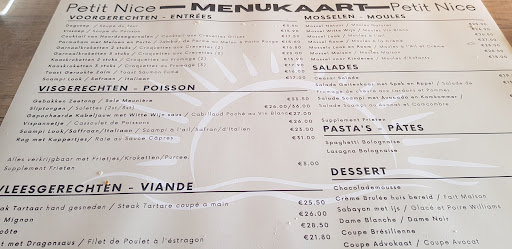 Wij waren vandaag met nog een ander koppel en hun zoontje bij Petit Nice gaan eten. Alles zag er veel belovend uit en de prijzen leken mij oké. We namen plaats en bestelde onze drank, voorgerecht en hoofdgerecht. Op ons voorgerecht hebben we 45 minuten moeten wachten. De garnaalkroketjes waren diepvries en niet vers. Daarna hebben we maar liefst een uur moeten wachten op het hoofdgerecht. Ook kwamen er mensen een half uur later aan een tafeltje tegenover ons zitten, dit waren blijkbaar vrienden van de eigenaar, zei kregen na nog geen 20 minuten hun eten terwijl wij voor hun daar waren en moesten wachten. Na het lange wachten krijgen we eindelijk ons eten. Het eten was smaakloos waarschijnlijk geen kruiding. We hadden 2 porties mosselen besteld deze waren niet vers, er waren veel mosselen kapot, ze waren overgaar en smaakloos. Mijn eigen portie scampies waren niet vers, diepvries dus, en voor 25 euro krijg ik 8 kleine scampies. De saus was niet lekker en er zaten stukjes kip in mijn saus die daar niet thuis hoorden. Mijn vriendin bestelde een steak deze had ze medium gebakken besteld maar deze was zo goed als helemaal gaar. Ook waren de frietjes die we bestelde diepvries. We hebben dit gemeld aan de ober maar helaas geen reactie. Nadat we toch wat hadden gegeten van ons bord omdat we honger hadden hebben we het personeel aangesproken over onze problemen. Uiteindelijk is mijn vriend , wie ook zelf chef, met de uitbater gaan praten en heeft hij zijn probleem uitgelegd. De man was alles behalve vriendelijk hij bleef vol houden dat er niets mis is met het eten. Hij geloofde niet dat er kip in mijn saus zat. Ook vroeg mijn vriend om de zak met mossel te zien omdat hij niet geloofde dat deze vers waren en de zak bleek 3 dagen oud. Ook op het feit dat de scampies niet vers waren zei de eigenaar dat het onmogelijk is om in België verse scampies te krijgen. Wat mij wel raar lijk omdat we letterlijk op een terras aan de dijk zaten en de verse vis markt niet ver weg is. Om er nog een schepje bovenop te doen noemde de eigenaar mijn vriend een goedkope Egyptenaar terwijl mijn vriend gewoon Italiaan is. We hebben uiteindelijk 200 euro betaald voor diepvries eten. Als ik jullie een goede raad mag geven ga zeker niet hier wat eten het personeel is onvriendelijke en je moet versprijs betalen...