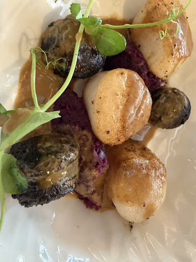 Daarna volgden de voorgerechten, die stuk voor stuk schitterend gepresenteerd en voortreffelijk van smaak waren: • Artisanale garnaalkroketten – klassiek maar perfect uitgevoerd, krokant en rijk gevuld. • Paté van everzwijn met ajuinconfituur en notenbrood – een heerlijke herfstige combinatie, mooi in balans. • En ikzelf genoot van de gebakken sint-jacobsnootjes met zwarte beuling, schuim van eekhoorntjesbrood en “Vedett IPA” – een verrassende en creatieve combinatie die echt fantastisch smaakte. Dit gerecht verdient zeker een speciale vermelding; ik zou het met volle overtuiging aanraden aan iedereen!