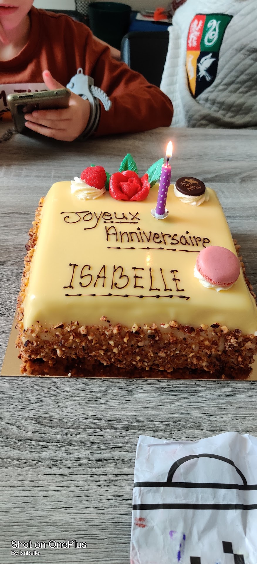 A 18h, voilà le moment de servir le gâteau. J'entaille le collant de chaque côté pour ouvrir la boîte, pose et allume la bougie et de suite les enfants se mettent à crier qu'il y avait une guêpe sur le gâteau. (Celle-ci à du mourir congelée).