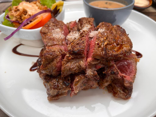 Read moreVerstopt in een zijstraatje vind je deze bistro. Ga niet af op de buitenkant want eens je binnenkomt, kom je in een compleet andere sfeer. Het is er gezellig en ruim. Genoeg ruimte om te zitten de tafeltjes staan niet opeen gepakt. De bediening is echt top, we zijn heel vriendelijk onthaald. Zelfs op een doordeweekse dag zitten er mensen te eten. Ruime keuze op de menukaart en echt leuk dat er een tekening staat welk stuk waar zit op het rund. Je krijgt ook uitleg over bepaalde stukken vlees wat je er van kan verwachten. Lekker steak gegeten met frietjes en champignonsaus, we kunnen makkelijk terugkeren met ook de kinderen mee want ook voor hen is er keuze op de kaart.