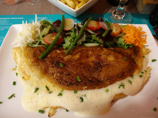 La perfection existe et j’en ai gouté la preuve ! Seul les vrais chefs savent qu’un œuf est l’ingrédient le plus simple dans toute la cuisine et en même temps le plus délicat et difficile à cuisiner à la perfection. Chef Bérenger du Café Inn à Ronse prouve qu’il maitrise l’art de préparer les œufs et de faire d’une simple omelette un mets de choix. L’annonce d’une Omelette façon ‘Poulard’ sur l’ardoise m’intriguait depuis quelque temps et ceci était suffisant pour me faire réserver une table. Accompagné par mon épouse (nous fêtions notre anniversaire de mariage), nous nous sommes installés à l’intérieur, loin des regards indiscrets. Madame avait craqué pour le duo de tomates aux crevettes : une assiette composée de tranches de tomates rouges et vertes, généreusement parsemés de crevettes grises et entourés par une multitude de garnitures qui lui était servie par Michel. Et moi j’avais droit à mon omelette dont je rêvais depuis plusieurs jours. Imaginez-vous des œufs qui n’étaient pas fouettés mais battus presque en neige (exactement comme on le fait chez la Mère Poulard au Mont-Saint-Michel). Un assaisonnement parfait et l’addition de quelques lardons et de morceaux de fromage (Reblochon ?) ainsi qu’une cuisson parfaite rendait cette omelette son résultat crémeux. J’avoue que je kiffe devant une omelette baveuse, mais la version crémeuse préparée par Bérenger a surpassé toutes mes attentes élevées. Lors de ma visite au Mont-Saint-Michel, je buvais un bol de cidre brut bien frais. Cette fois-ci je n’ai pas regretté de m’offrir une Omer… Le gout de cette bière se marie à perfection avec l’omelette ! Seule remarque : j’aurai préféré un quignon de pain gris au lieu des frites. Le pain m’aurait permis de le tremper dans les œufs crémeux et de nettoyer mon assiette à fond, comme j’avais tant d’envie de faire… Mais tout compte fait, c’était du ‘ouf’ ! Bérenger prouve qu’il possède l’ingrédient le plus secret et presque introuvable pour réussir une bonne cuisine : la passion ou...