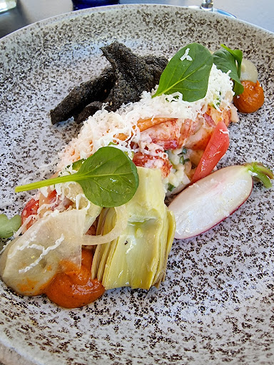 Eerst kregen we kreeft met romesco, artisjok en ricotta (foto). Daarna kabeljauw met groene asperge, spitskool en daslook. Gevolgd door kalfsvlees in drie bereidingen met gebrande prei en bergamot. En gevolgd door een dessert van aardbei, rabarber, basilicum en yoghurt. Superlekker allemaal en zeer mooie presentatie. En dat aan €52!!