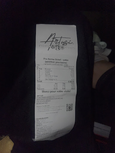 J'appelle le garçon, pas pour un scandale mais pour bien préciser quau moment de la commande à aucun moment l'accompagnement et la sauce n'ont été stipulé payant, et là on me dit que c'est stipulé sur la carte sauf rien ne dit sur la carte que si on commande une viande elle est servie "nue" mais le pire c'est que le garçon se réfugie dans une bien drÎle d'explication Cad que chez Artusi c'est comme en Italie, si c'était comme en Italie on aurait eu du pain de l'huile d'olive et des olives à l'apéritif et bien-sûr une carafe d'eau....