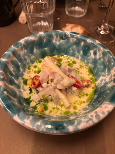 My bf and I spent about 110€ not so bad for the quality and that includes a nice bottle of a red wine. We took 2 menus, one with and another without dessert. I took the shimenji + bar ceviche for entrée, the salmon portobello for the main dish and the cheese for dessert (that we shared). The plates were very beautiful (see photos) and really enticing to the eyes! The shimenji ceviche was delicious, they added coconut milk to add density to the usual acidic ceviche and I think it's an awesome idea! The salmon, on the other hand, was cooked to perfection, pink on the inside and the miso sauce was delicious although I didn't taste the miso that much. The portobello was a good source of umami to this dish, and I must say it ended up a very flavourful pairing.