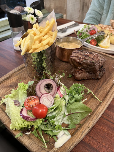 the service was great, food came out very fast, portion sizes were large, and most importantly the food was INCREDIBLE! we ordered steak frites and chicken skewers and everything was cooked to perfection. fries were perfectly crisp, steak was perfectly medium cooked, and the chicken was out of this world. soft and tender with just the right amount of seasoning!!!