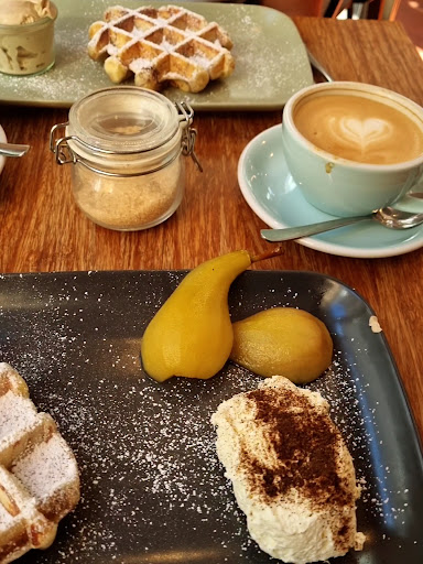 Read morePardon is a charming waffle café in the Parvis St Gilles in Brussels. The atmosphere is calm and relaxing. The staff is nice, attentive and friendly. They offer a variety of set menus for brunch but you can also build your waffle by choosing the base of the waffle (plain, chocolate chips, or cinnamon) and the toppings. I went for the cinnamon waffle with the fruit of the day - poached pear - and whipped cream simple but absolutely lovely.