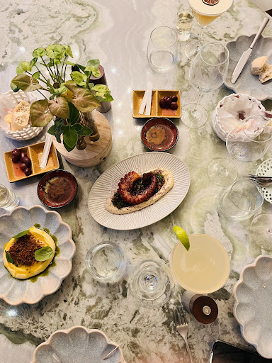 The cocktails are superb, the Zeyya Mahatan was tasty and complex. The octopus was stunning, perfectly cooked and all the flavours worked harmoniously. The lobster tail was delicate and decadent balanced with rich, creamy pasta. The beef fillet was exceptional, smoky, charred, and pink in the middle. Finally the crème catalane was light, floral, and a splendid way to finish of a perfect first evening here...