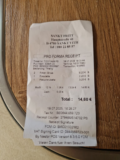 Read moreNach einem langen und anstrengenden Wandertag hatten wir,drei Personen,einen Bärenhunger und Lust auf belgische Fritten! Sind durch das hübsche Städtchen geschlendert und auf "Sankt Vitt" gestoßen. Name ist Programm!? War gut was los, kann also nicht schlecht sein. War ein Irrglaube. Wollte was typisches essen, das wären z.B. Fritten in Kombination mit Kroketten. Hausgemachte und zugekaufte. Saucen in guter Auswahl. Kantinencharakter wurde bereits geschrieben, stimmt, aber mir ist wichtiger,daß es sauber ist, das Personal einigermaßen freundlich und das Essen zumindest etwas lecker. Sauber war es, die Bedienung zurückhaltend,aber nett, die Dame im Thekenbereich hatte vielleicht zu viel Fett eingeatmet, ein Gesicht gezogen,wie nach dem Verzehr von dreimal "Sankt Fritt-Fritten". Die waren langweilig.fad, labbelig und ungewöhnlich hell. Die selbstgemachten(?) Kroketten haben die noch getoppt. Hab mich über die Kombi eh schon gewundert, das spielt bei der Bewertung auch keine Rolle, aber der Geschmack war seltsam. Künstlich, nach für mich undefinierbaren Geschmackstoffen. Was die Sauce auch nicht retten konnte, genauso fies. Der Hunger hat es runtergetrieben und eine Flasche köstlichem belgischen Biers, war das einzig Gute, zum runterspülen. Hatte vorher gekämpft,, damit wir nicht zu Mac Donalds fahren ( mag die Fritten da auch nicht so besonders, die sind aber Gold zu denen hier). Dieser Ort scheint zu polarisieren. Von grottenschlecht bis zu Begeisterungsstürmen -alles dabei. Bin eigentlich zurückhaltend bei Bewertungen im Ausland, sonst sind es wieder die besserwisserischen, nörgelnden Deutschen. Aber das Essen,tut mir leid, ist eine Katastrophe und selbst für gratis würde ich da...