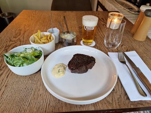 Een filet pur betaal je er 44€ en voor die prijs krijg je als groente enkele blaadjes kropsla. De - hoop en al 6 - blaadjes kropsla kregen we dan nog in één kom voor 3 personen. We vroegen drie saignant gebakken filet pur's en ze waren allen te hard gebakken, zelfs méér dan à point. De champignoncrème was ook veel te zout. Mijn vrouw nam de asperges à la Flamande maar kreeg een zoute geel/groene brokkenpap die er écht niet smakelijk uitzag. Als je een specifieke bereidingswijze op de kaart zet, dan moet je het gerecht ook volgens die bereidingswijze serveren. Indien niet, noem het dan "asperges De Vijhoek" of zo. De asperges waren bovendien hard en niet genoeg geschild.