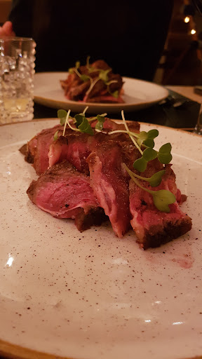 The drink tasted very watery. The bite was fairly expensive for such a small serving. The steak just made me sad. I ordered a medium rare tenderloin (filet pure). I received a fairly cold piece of seared raw, tough meat. Adding to the disappointment was the fact that despite our early arrival, we waited quite a long time for the main course. Most of the other tables were already having coffee or dessert.