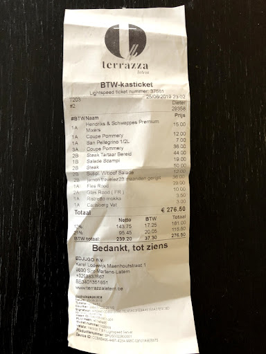 TL;DR onvriendelijk, niet lekker en duur! Lange versie: Hier valt niet veel goeds over te zeggen na een zeer onaangenaame diner in de terrazza. We werden op een zeer koude manier ontvangen, wouden een plaats op de mooie verwarmde terras maar die bleek volledig gereserveerd te zijn. Wij doen hier niet moeilijk voor, binnen is ook mooi. In totaal waren we met 7 personen, waaronder een meisje van jonge leeftijd die een sociale stoornis heeft (triple X syndroom). We nemen een mooie aperitief terwijl we naar de menu glanzen. 15min later hebben we gekozen, maar het meisje had wat problemen, dit werd door de ober HEEL duidelijk gemaakt dat het hem te lang duurde. Na een 2de aperitief kiezen door schuldgevoel had ze iets gekozen (25min, is dat lang?). Ikzelf had ribbetjes gekozen, mijn favoriete gerecht. Eens die aankwamen (heel snel) was mijn goesting al snel weg. Het bord werd op tafel "gesmeten" en frietjes kwamen er maar niet aan. De ribbetjes waren droog, moeilijk te snijden en deden al snel pijn aan mijn tanden om het vlees van de been af te rukken. Oude mise-en-place? In ieder geval waren alle 3 porties even slecht. Majonaise moesten we ook 2 keer vragen want die kwam ook niet af. Zelf wou ik vragen om een nieuwe portie te brengen, maar was meer bang kleingemaakt te worden door de arrogantie van die bepaalde ober. Nu, om het echter wat korter te houden komt het op neer dat we zelf geen dessert meer konden bestellen want de keuken was gesloten (21.55u). De ober deed dan "de moeite" om eens naar de keuken te gaan achter de hoek en kwam af met "sorry, de keuken staff is al vertrokken". Blijkbaar waren er dus klanten in de keuken of zo, want je kon er mooi in kijken. Studio Brussel stond ook luid genoeg voor de leden die een pintje aan het drinken waren in de keuken terwijl de restaurant muziek een soort van interferentie maakte (ook "remix" genaamd :P). Dit allemaal om te vermijden een bolletje ijs op een bord te plaatsen. Oh en de terras? Niemand kwam nog af na ons, plaaaaaats genoeg! Ik vond het heel jammer want wij zijn zelf van de buurt (Deurle), gelukkig zijn er nog goeie restaurants in de buurt. Ik kom er voorlopig niet meer naar. Nu, na een paar andere reviews te lezen zie ik dat diezelfde ober blijkbaar door andere mensen ook niet geapprecieerd word....