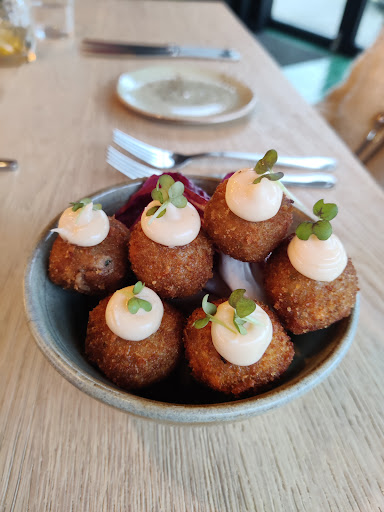 Read moreWe hebben hier geluncht en hebben heerlijk gegeten. De kaart biedt een rijk palet aan niet alledaagse gerechten en wijnen. Als voorgerecht hebben we 'Kroketjes van gekonfijte eendenbout met tandoori' gegeten. Ik was aangenaam verrast door de verfijnde smaak. Een echte aanrader! Als hoofdgerecht heb ik de garnaalkroket gegeten en die was ook heel lekker. In de kroket zelf zaten weinig garnalen, maar er zat een mooie portie bij de witlofsalade. Prima gedaan! Mijn partner heeft de risotto met gamba gegeten en was ook zeer tevreden. Het geserveerde donkerbruine brood was het beste dat ik ooit gegeten heb. Enkele bijkomende voordelen van dit restaurant zijn de ruime openingsuren en...