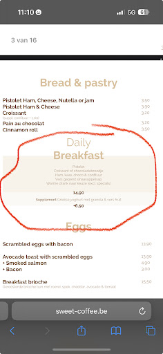 Ons bezoek was helaas een grote teleurstelling. Op de menukaart stond dat het ontbijt €14,90 kostte, inclusief een pistolet, koffiekoek, fruitsap en een warme drank (excl. “specials”). Ik vroeg expliciet of een latte als “special” werd beschouwd, en kreeg te horen van het personeel dat dit niet zo was.