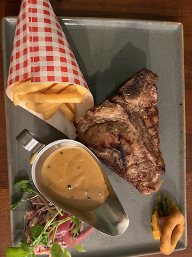 5 min later komt ons eten er aan mini kommetje goedkope sla zakje kroketten, 1 steak tot karton gebakken (diepvries vlees?), niets van smaak meer, je kon enkel nog het verbrande van de gril proeven (200gr steak) en 1 steak was nog bleu (400gr steak)
