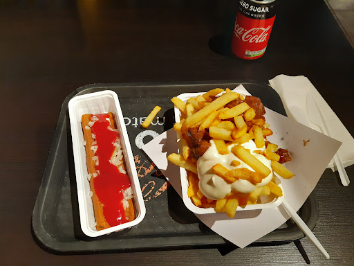 Grote friet met stoofvlees en mayonaise, frikandel speciaal en een cola kosten hier 12,50 euro. Ter plaatse eten betekent plastic bestek. De frieten waren half gebakken, het stoofvlees taai met veel stukken vet. De frikandel speciaal smaakloos met teveel tomatenketchup en te weinig mayonaise en uitjes. Als je van lekkere Belgische frieten houd moet je hier...