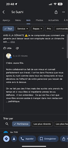 Read moreAVIS Ă LA GĂRANTE â ïžJe ne comprends pas comment une gĂ©rante peut laisser seule son employĂ©e seule un dimanche soir..