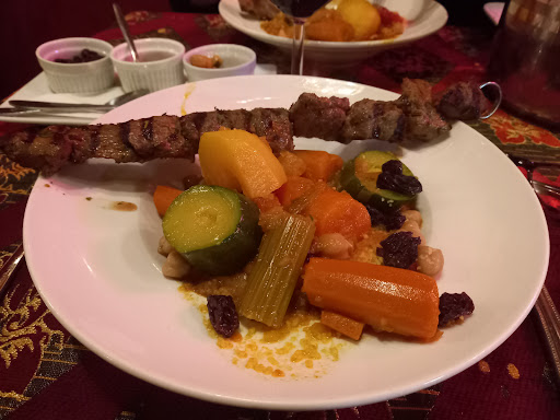Côté cuisine, expérience parfaite. Couscous et Tajines excellents. Carte des vins classiques. Dessert ok. Prix: 81€ pour deux personnes sans entrées avec une bouteille de vin et apéritif.