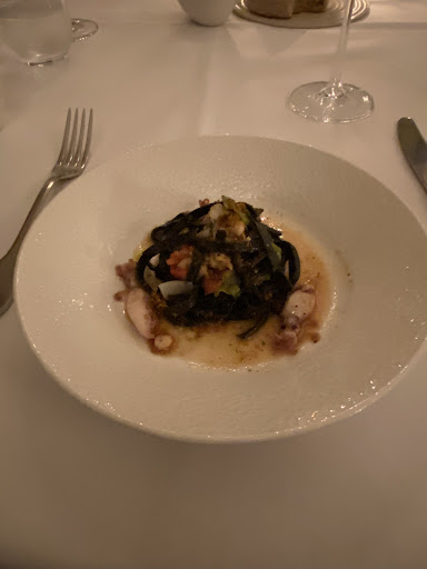 Door met een Cambrugiano 2017 van Belisario, Verdicchio met korte houtrijping, verfijnd met vleugje vanille en subtiele mineraliteit. Waarbij Fettuccine alla Pescatora à la Fabio. Ofwel zwarte lintpasta met sappige tomatensaus royaal gevuld met stukjes pijlinktvis en schelpdieren afgewerkt met Siciliaanse crumble. De pasta was in kleine stukken gesneden waardoor je hem comfortabel met de lepel kon eten, fijn. Pure smaken die keurig in balans waren met de wijn. (7,25)