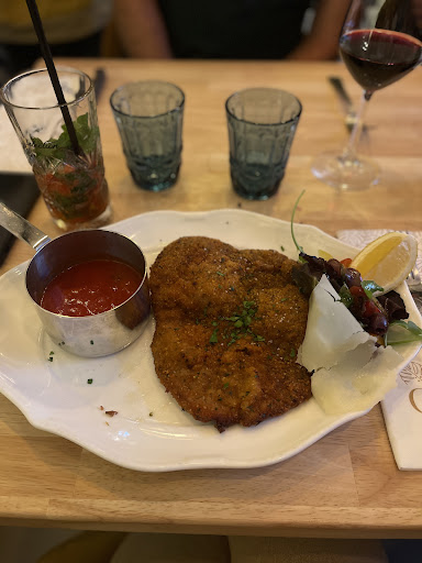 Bonjour. Le cadre est très beau et le service super. Les vins et apéritifs sont très bons et vin servi à bonne température. Les serveuses sont au petit soin. Par contre, dans l'assiette, c'est un autre niveau dommage. Calamars sans goût , sans saveur. Beaucoup de panure et peu de calamars. Pâtes à la truffe pas mauvaises mais pour 26 euros, je m'attendais à autre chose. Cela ne casse vraiment pas la baraque. Pâtes gratinées au fromage trop al dente et pas de gratin présent. Tiramisu super acide. Bizarre mais pas bon.