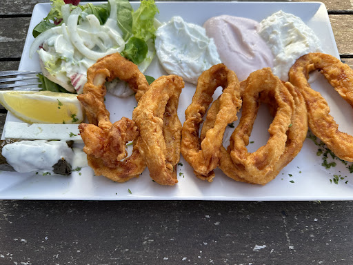 Calamari, Feta and tzatziki were tasty. I couldnt say it about gyros met pita - meat was too chewy and hard to eat. Fries were fried in the same oil as sea food so we could feel the taste of shrimps in fries... Souvlaki van de chef - in this case meat was okay (chicken,lamb and beef) but it was served with cold orzo in tomato sauce. Plus for a really nice and friendly service, waitress came few times and to...