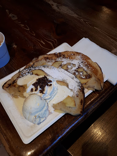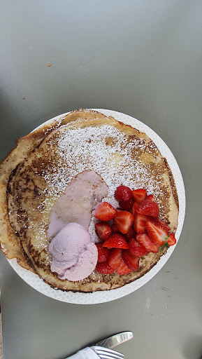 Ham and cheese pancake is not their thing, as you can see in the sad cheese pancake in the photo :( On the other hand, their strawbery & ice cream pancake was really good! One thing that I liked a lot in their pancake was that the dough was doubled. This is specially nice for sweet pancakes. Cold drinks and ice creams were also nice. A very good stop if you are cycling in the region! We seat in their garden between the grape plants, really beautiful! Just don't order the cheese pancakes (they come with sliced cheese :_( ) and you...