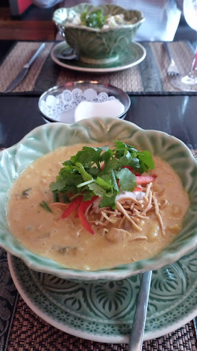 Read morePlats copieux mais fades / Bon service / Prix corrects. Clairement pas 4.1 (note au moment où nous écrivons ces lignes). Nous avons l'habitude de manger thaï et, bien que le cadre et la décoration de ce restaurant soient faits avec goût, nous avons été déçus par les plats qui manquaient vraiment de saveur, d'assaisonement au point où nous avons dû demander du sel à la serveuse. Le seul met sortant du lot, une soupe coco-poulet-citronnelle. L'apéro maison à 7€ est servi dans une toute petite flute et consiste en un mélange quelconque de sirop et de jus de fruit avec une pointe à peine perceptible d'on ne sait quel alcool. Les crudités des entrées sont arrangées d'une manière tellement alambiquée et intriquées à du persil (on vous met presque une botte dans le plat) qu'on ne les a pas mangées, on a l'impression que ces bouquets ont été manipulés 25 fois et préparés à l'avance, c'est beau à voir mais inutile... Mais pour tout le reste, les plats comme expliqué, même si le rapport qualité-prix est là, que c'est copieux et que le vin au pichet est très correct, nous ne...