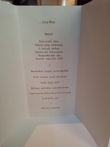 Read moreGisteren voor de eerste maal in deze topzaak gegeten ter gelegenheid van het vrouwtje haar verjaardag. Bij het binnenkomen werden we heel vriendelijk ontvangen door Lies. Gezien het weekend was, gingen we voor het Lesco menu, een menu all-in met aperitief, 6 amuses, een 5 gangenmenu, water en koffie. Het aperitief bestond uit meerdere keuzes, waarbij ik de voorkeur gaf aan gin-tonic en het vrouwtje de Duitse sekt. We opteerden eveneens voor de aangepaste wijnen, die naar ons mening een aanrader zijn. Elke wijn paste perfect bij het het gerecht en werd door de gastvrouw voorzien van de nodige uitleg. Ook nam de gastvrouw de tijd om een babbeltje te slaan met de aanwezige klanten en bood ze spontaan aan om enkele foto's te nemen van de aanwezige jarigen, waaronder mijn vrouw. Ik kan niet zeggen wat mijn favoriete gerechtje was, want ik heb vanaf minuut 1 van elk gerecht genoten. Elk gerecht werd door de chef persoonlijk gepresenteerd aan tafel. Chapeau, jullie chef heeft echt talent, in en naast de keuken. Er was ook nog de mogelijkheid om een bordje kaas als extra gang of als vervanger voor het dessert te nemen. Wij opteerden voor de extra gang en gelukkig maar want wij hadden niet graag gekozen tussen het kaasbordje en het ijs van olijfolie. Na ongeveer 4,5 uur tafelen zijn we moe en voldaan huiswaarts gekeerd.