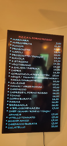 Read moreDe kaart beperkte zich vanavond tot enkele voorgerechten en enkel pizza's als hoofdgerecht. Op zich niet slecht, er waren enkele leuke suggesties en de chef heeft duidelijk talent. De tijd tussen het afruimen van het voorgerecht en het opdienen van het hoofdgerecht duurde wel meer dan anderhalf uur met ruim twintig minuten tussen het serveren van de eerste en de laatste pizza aan onze tafel van acht. In een ruimte van ongeveer twintig eters is dit toch echt wel te lang. Het feit dat alles met veel zorg en vers wordt bereid en wordt gebakken in een houtoven mag hier toch geen excuus voor zijn. Helaas was het voor ons dan ook niet mogelijk om nog een dessertje en/of koffie te kunnen nuttigen na de hoofdmaaltijd, anders werd het ons echt te laat. De enige dienster had haar handen meer dan vol met de service, maar kweet zich toch met succes van haar taak. Ondanks het feit dat ze op een gegeven moment duidelijk op haar tandvlees zat bleef ze vriendelijk en bleven de tafels bediend. We schrijven Il Forno Rosso nog niet af wegens de kwaliteit van het eten en de gezellige ruimte, maar ik zou de chef toch aanraden aan de slag te gaan met de minpunten, want bij een vol huis zullen de problemen alleen maar erger...