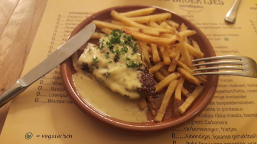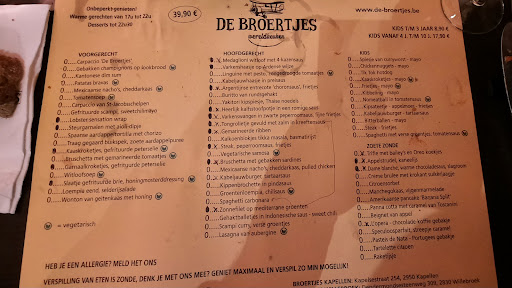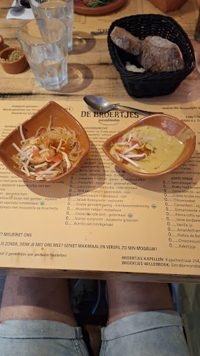 Read moreGisteren bij De Broertjes gaan eten na zo veel goeds te hebben gehoord over dit restaurant. Hoe het aan zo'n goede reviews komt, zal ik nooit begrijpen. Het concept is op zich tof, je kan veel verschillende dingen proeven, de executie is helaas enorm ondermaats. Per ronde kan je pp 2 dingen kiezen, wat je ook kiest, of het nu voorgerecht of hoofdgerecht is, het is meestal 1 max 2 happen groot. Ze komen je papiertje voor een nieuwe bestelling pas halen als je bordjes leeg zijn, dus je krijgt zo'n 2 happen per 20min. De kwaliteit van het eten is redelijk schandalig. In de toekomst ga ik nog liever naar een lunch garden. Vele van de gerechtjes (bv: sensation wrap, gefrituurde brie met honing, wonton van geitenkaas met honing, bruschetta,...) waren smakeloos en teleurstellend. We vermoeden ook dat 90% diepvries of pakjes eten is. Dit vermieden werd versterkt door een stukje grijze plastiek, dat we terugvonden in de linguine. Kortom: een absolute ripoff, 108 euro voor 2p, slecht eten en we zijn er op de koop toe achteraf allebei niet goed van geweest. Kers op de taart: de dikke schimmel plek op de muur bevorderde de appetijt...