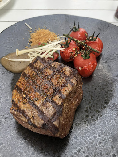 Read moreI expected more from this restaurant, which is located in a very beautiful spot with the option to dine almost by the water. The two of us ordered a Rumsteak Limousin and stone grill (heated stone placed on table, on which customer can grill the meat). The rumsteak was brought to the table and served very simply with five cherry tomatoes, (see picture) and some sauces on the side while the fries were brought five minutes later. I added some olive oil to make the meat a bit more palatable (it wasn't tender). The meat for grilling was brought before the heated stone, and again, we had to wait another five minutes. While the grilled meat was good, I can't say the same for the rumsteak. Additionally, I believe that dishes should be served together or at least not five minutes later, including the sides. Some people at a table not far from ours asked us for the bottle of oil just to add more flavor to their meat. In summary: great location, clean environment, one good dish, the other somewhat disappointing, and service not quite up to par, though the waiters were polite. Perhaps it would have been better to choose the sole, which seemed well-prepared. Prices...