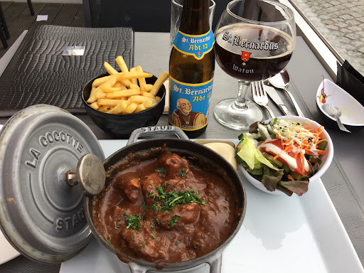 Dan blijft alleen het eten nog. Er werden 2 verschillende gerechten genomen. Huisbereide Vlaamse rundsstoverij met oud bruin bier en frietjes. Steak " filet mignon " met sla en frietjes was de tweede keuze. De rundsstoverij, in ruime portie, was lekker maar de smaak van oud bruin bier heb ik niet gevonden. Slaatje verzorgd en frietjes lekker. DE " filet mignon " gevraagde bakwijze bleu, kwam deels als bijna à point en deels seignant op het bord. De jonge dame die de steak bracht werd hierop gewezen , zij excuseerde zich en nam het bord terug mee naar de keuken om het 2 minuten later opnieuw aan te bieden met de steak volledig open gesneden en de boodschap uit de keuken dat er toch een blue gedeelte inzat. Geweigerd en terug naar keuken. Het duurde heel lang voor een nieuwe steak geserveerd werd. De andere tafelgenoten hadden reeds gedaan of bijna gedaan. De nieuwe steak kon gezien zijn vorm nooit blue gebakken zijn, driehoek die op de dikke kant blue was en op de lage kant bien cuit. Maar blijkbaar kon de keuken niet beter en is het gedeelte dat correct gebakken was opgegeten en de rest bleef liggen. Extra frietjes gevraagd en gekregen maar lachwekkend weinig voor 2 personen ( denk zeker 15 frietjes ), mayo gevraagd en gekregen maar een plastiek potje van Vandemoortele. Een oud leerling van...