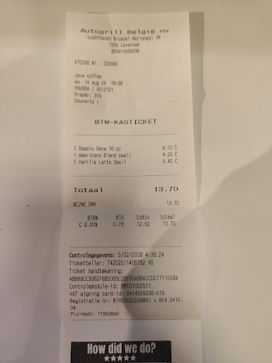 Read moreIn the arrival zone of BRU airport you will find these pretty coffee shop. It's good meeting point just behind the exit from the luggage-pick-up and customs control. If you need to wait, you can have your grande mug and make watching people and have an eye direct on the screen of baggage belts ... For travellers is good first stop to have a real good coffee, after awful chemtrail-coffee! The dark baristas looks like directly imported from Kenia, the white dishman are very busy ... this is not typically...