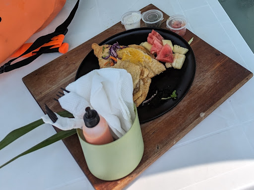 Not sure the name of the restaurant but it was the 2nd one in next to the one with the colourful chairs and it's the one with the green deck chairs and a few plastic tables in the water anyways... it has the best stuffed fry jacks I've ever had and since arriving in Belize and I have had fry jacks every day since I arrived sometimes even twice a day and I ate at a place that specializes in fry jacks but still this place beat them all! The swimming was okay. Kinda boring after a little while like being in a huge kiddie pool. You can walk the whole way out like a few hundred yards, the water was clear and warm. I can only wade around in the water for so long before getting bored. Kids would probably love it though especially if you bring them goggles and maybe a snorkel. Some new to beaches, elderly, or differently abled adults might be amused for a while easing their way into snorkeling in this shallow water that has 6 or so different little fish varieties easily observed close to shore. To get there we rented a golf cart in San Pedro for under $60 for the day including gas. You can probably find one for closer to $50 if you shop around and haggle and compare prices between the numerous golf cart rentals but we figured the $10 difference wasn't worth the time and effort as we wanted to get up there quickly and beat the rush and it worked since we were maybe the 2nd or 3rd group up there and had our choice of parking, tables, and lounge chairs. I would have made the drive just for that amazing stuffed fry jack. Sorry for the poor picture quality of the food. The food just happened to be in the foreground of another pic and I had to crop it and zoom in. The fry jack was so good we practically inhaled it and it was gone so fast there was no time to take a picture and by the time we realized we should have gotten a pic of it all that was left was a drop of sauce on the plate. 😅. Service there was also great. The staff was very attentive, friendly, enthusiastic, and really hustled back and forth bringing the food...