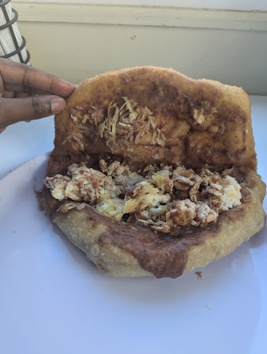 My husband got a chicken fry jack and I got an egg, bean and cheese fry jack. Both were well-seasoned. The chicken was pleasantly spicy and the beans were richly flavored. The fry jacks are thick and doughy, but perfectly soft. You'll receive utensils when dining in, but the easiest way to eat the fry jacks is to pick them up and bite in!