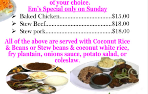 Read moreWhere do I began! My first night in Caye Caulker I ordered take out and was lucky enough to pick Em’s! I had grilled fish that was amazing with salad and coconut rice and beans. Later in the week I ordered the grilled chicken burger and fries TWICE and each time SO delicious! The husband of the cook delivers and he is so kind and full of good vibes! Then, I break my hand on the island. I mention it to them when I’m ordering and they offer to help me and bring anything I might need from the store as well. This business is good ALL AROUND!! The food, the price, the family that owns it!! Today is Sunday and I got the Sunday special, I chose the baked chicken, white rice and stew beans and potato salad. THE BEST!!!!! I ate every bite!! I’ve also ordered the salad two times and it’s also very fresh and good! Again, when the husband delivers, he reminds me to not hesitate to ask for help! I can’t say enough good things about Em’s!! I wish them all the best and I know that they will prosper! Amazing food and people!! May God bless them and their business. I promise to stop in before I leave to meet the wonderful chef!! Bless up! 💕🙏🧘🏻♀️ Broken hand Pam from...