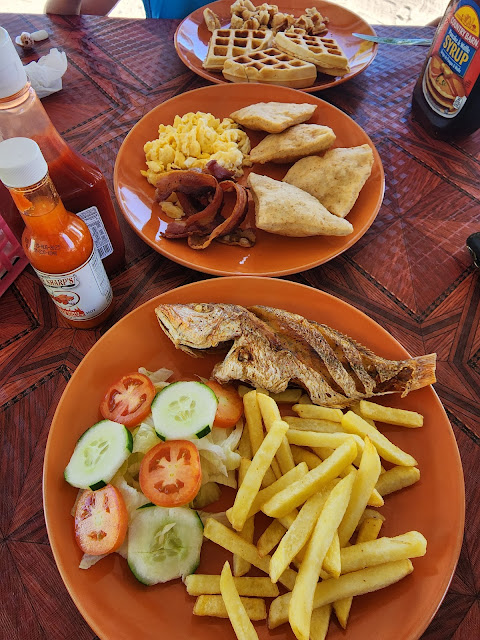 This is our second visit to Belize and I’d come to the conclusion that while we’ve had good food here, we were unlikely to find anything exceptional. That was until we pulled up here on a kayak for lunch. First it was the ICY cold Belikin that impressed, chunks of ice still clinging to the bottle. The perfect accompaniment to Garifuna fried chicken and grilled fish. The chicken was a rec from our kindly server, Gaspar, whose mom is the chef. Excellent and unique spices coating a perfectly fried (aka NOT greasy) quarter chicken. Fish was equally great (missed a good photo opp on that piscine beauty). The accompanying fry jacks were outstanding in both taste and more fried perfection.