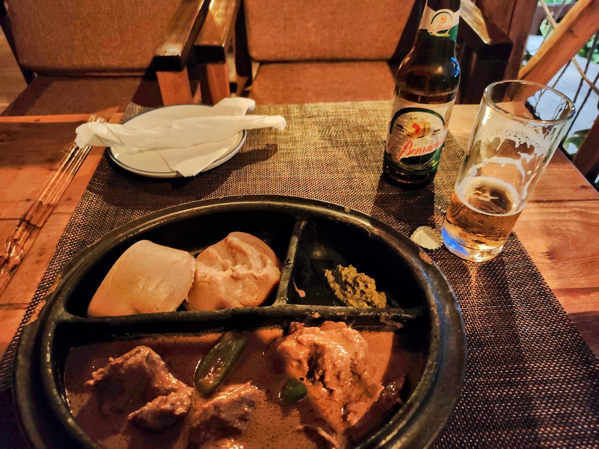 This is a nice and really "Le Lieu Unique" place to be and eat. And with the nice upstairs area, open from three sides, it is also airy and thus nice to sit on a warmer evening. Well designed and maintained and clean. Staff is very friendly and kind. They helped me out with selecting my béninois dish (travelled quite a bit in Africa, but I learned about Benin for the first time this year). The dish was delicious: mutton in sauce arachide and fufu. But they have also a big choice of other kind of dishes: for every ones taste is something to find! They have life music in the weekend too! At the same place they have a stylish bakery (bake their own bread, pastries, Baguettes, also for the restaurant). There I took my breakfast the next morning, cool place to be. Similar concept of African contemporary style I would say. Nice pastry and bread, all displayed in an attractive way. Again nice staff, good coffee and I had a nice croissant and pain au chocolat ! Certainly, in the same street there are a few other places to eat, but they tend a bit more towards bars, or are the local maquis, all good I presume. But while this place has music, you can still really relax and have a conversation: "The Unique Place" to be in this...