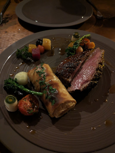 Duck A bit dry but seasoned well. Nothing outstanding. Came with a phyllo pastry filled with a weird flavor that I didn't particularly enjoy.