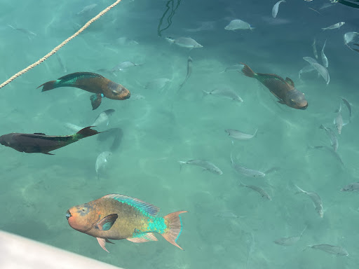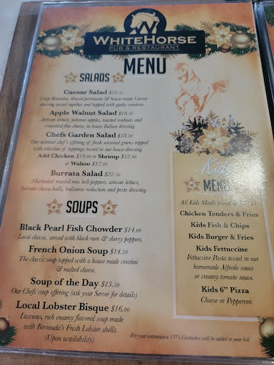 Read moreWe were originally heading for Wahoo's but the wait was far too long for an outside seat, so redirected to the White Horse. They managed to sit our group of 5 during a busy May Saturday, outside as requested, within approx 5-10 min. Pretty classic Bermuda lunch fare options w/ several British pub standards on the menu as well. Food is pretty tasty, as are the drinks, but not particularly memorable. The best part of the meal (and what made me return) was definitely sitting outside on the patio, up against the railing, and feeding the fish bread scraps and french fries. (This feels super wrong, but apparently these fish love french fries!) Some of the largest parrot fish I've ever seen and they were all practically on the surface showing off their colors as our free lunchtime...