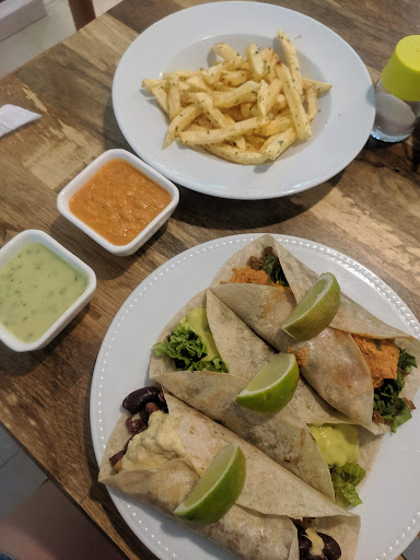 I was so excited when I found this place, unfortunately it didn't live up to my expectations. The restaurant is in a beautiful house, however, the furniture and decoration were bland and the painting on the wall looked as if it was remains from a children's bedroom. I was the only guest and promptly attended to, but told the waitress I'd need a few minutes to decide. Because she didn't check back with me I had to get up and place my order at the counter. Two of the five smoothies they had on the menu weren't available. I ordered three different types of Tortillas with a side of chips. Food and smoothie were served at the same time, despite the fact that it was 35°C outside and I'd have loved to have my drink straight away. The tortillas were nice, the one with soja meat, however, was very bland and dry. The chips looked awesome but they had so much salt that I couldn't eat them. Throughout my stay in the restaurant the waitress didn't check on me and when I had finished I had to go to the counter again to pay. Could be that they were having an off day, I hope so, because the space is lovely and the available dishes look yummy. I probably wouldn't go...