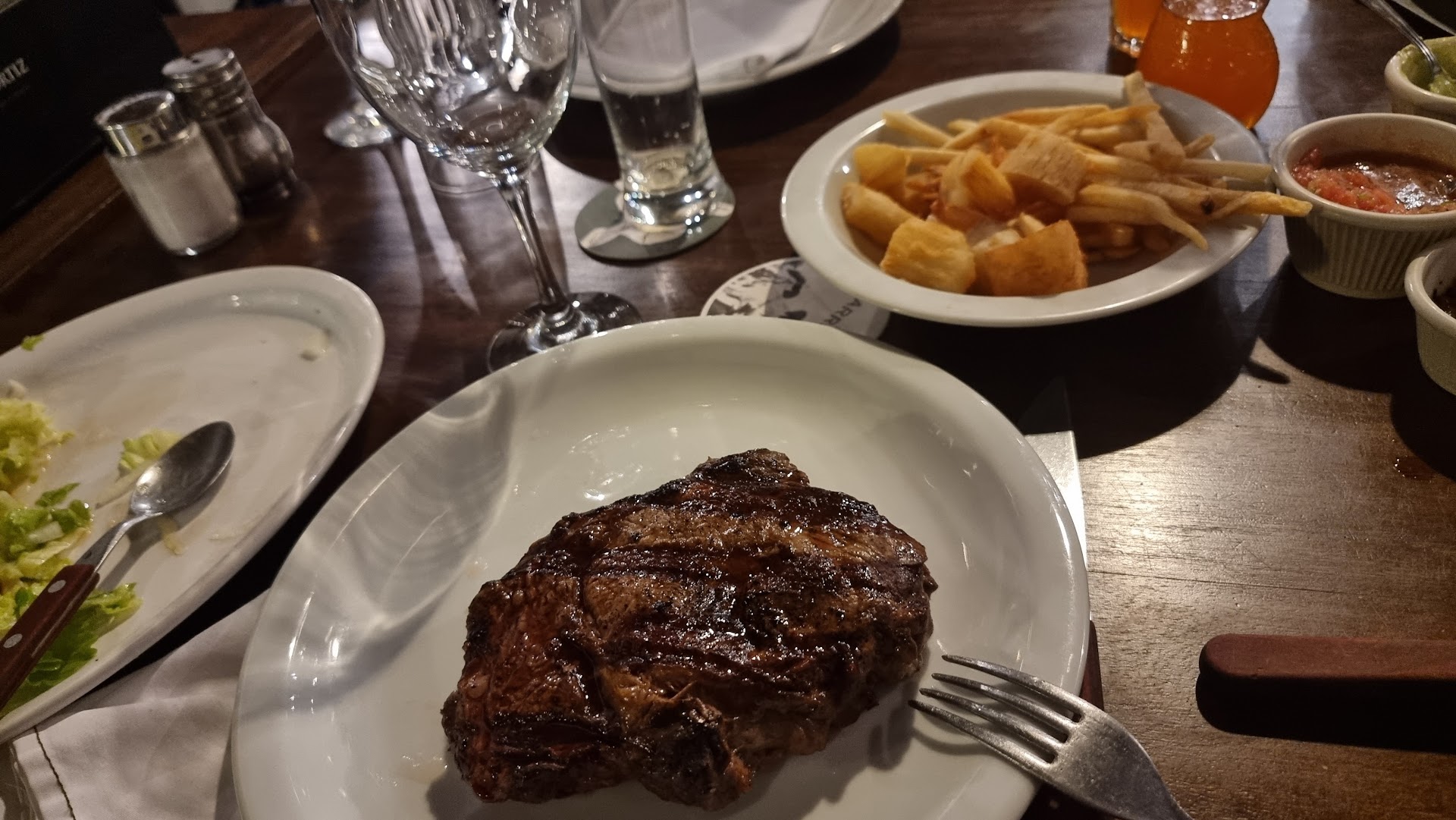 Alta expectativa para tan triste realidad, desde el momento del ingreso al lugar fue tedioso, teniendo una invitación de reserva al ingreso la persona que atiende muy poco empatica no encontraba la reserva usaba una tablet simulando que ayuda al comensal cuando en realidad lo único que hacía era perjudicar porque sin necesidad de ayuda ya sabía dónde tenía que entrar, el restaurante es pequeño ni idea que uno se pierda, al ubicar la reserva no se digno a indicar ni acompañar para lo cual solo vi un obstáculo de ingreso tedioso, una vez dentro podría decir que de toda la noche la cerveza fue lo único en su punto, fría y sin arrebatos la cerveza no había que más pedir, ahora yendo a lo importante que es la carne, eramos varios comensales y cada uno pidió diferentes cortes de los cuales la verdad por el precio que te cobran, podría decir que ninguno vale lo que piden tanto en sabor, en cocción y presentación, solo te llevas desilusión... me explico, todos los cortes estaban secos, el jugo que disfrutas de la carne será solo el que te ponen al servirte encima porque por dentro no tienen nada de jugosas, la sal no queda en su punto y pedí un 3/4 de cocción pero te entregan una carne cocida seca, tuve que reclamar a lo que amablemente me cambiaron por un termino medio pero el resto de comensales por vergüenza no se quejaron para el cambio de las carnes y no indicaron al mesero su queja, peero luego internamente todos sintieron una carne seca, sin sabor y en una cocción mediocre, aun con el intento de que los meseros tratan de dar una buena atención, la comida no lo vale, las carnes vienen acompañadas de ensalada, papas fritas, yuca y arroz graneado, en este punto hay dos cosas que no me agradaron, la ensalada te sirven en una gran cantidad donde solo verás lechuga con unos cuantos tomates para ir de pesca, la yuca y la papa frita en un excelente punto tanto en corte cocción y sabor, terminando los acompañamientos debería poder elegirse entre arroz graneado y arroz batido, una pena que solo ofrecen un arroz graneado que la mayoría de mesas ni lo comen, yo preferiría y me agrada más la carne acompañar con arroz batido, una vez que termines de comer, te darás cuenta que tendrás una cuenta alta de pagar, un servicio de recepción pésimo, de mozos que cumplen con su trabajo y de comida que no esta a la altura a lo que cobran, el lugar tampoco es wuaw de elegante, se siente un poco apretado entre mesas, pienso que podrías intentar probar otro lugar, pero esta es mi opinión que de pronto esperaba compartir otro evento, cumpleaños o aniversario en este lugar pero que con la experiencia vivida creo que...