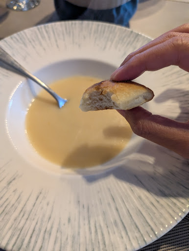 The grilled flatbread (or bread) served as an appetizer had a well-balanced and layered flavor profile, crispy on the outside and soft on the inside. It wasn't fancy, but it was delicious. It was served with a cream of broccoli soup. The soup had a good level of saltiness, and you could taste the subtle aroma of the broccoli. It paired very well with the flatbread. For the main course, I had roasted chicken with risotto and mushroom sauce. The chicken had a grilled aroma and simple seasoning, which went well with the mushroom sauce. Their risotto was the only one I've had in Europe where the rice was cooked through – thank goodness! I found this meal extremely satisfying.