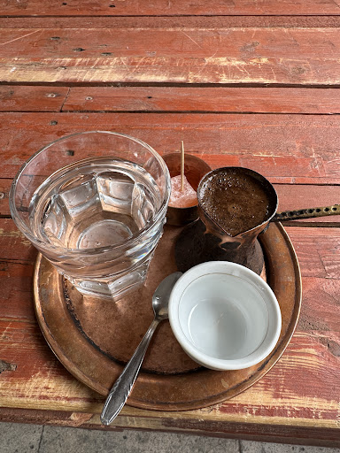 The coffee: presented to each client on its own copper tray, with the coffee grounds brewing in their own little copper carafe. On the side was a glass of chilled water and a tasty rose-petal flavoured Turkish Delight. The owner teaches you how to complete the brew and pour it into your cup. The flavour concludes the divine tale. You need to do this.
