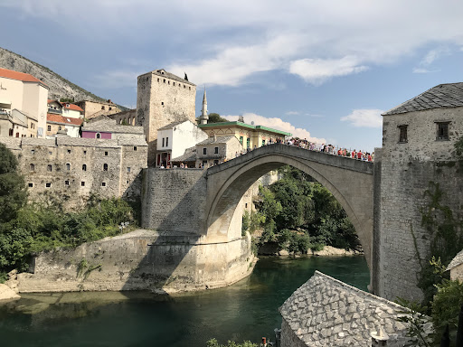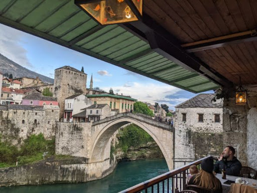 Read moreThree tables at the very top of this super friendly Mostar restaurant have stupendous views of the Old Bridge while being covered so you don't get wet if it rains (as happened while we were eating). Given that this is obviously a place for tourists one might expect a so-so meal at an expensive price. However, while a little more than local average the prices were fair and the cooking excellent ( delicious trout particularly, good red wine by the glass and excellent Loza). However, what made the experience particularly memorable was the staff who were not only friendly and attentive - they went beyond the call of duty to retrieve a pair of reading glasses that had tumbled off our table and landed in the fenced yard area of a different, closed premises way below. That required climbing over sharp metal railings then jumping around 2m down a wet wall (and somehow getting back up again). A physical feat, but also one of considerable bravery give the wet conditions and possibility of injury. All in all this was an unforgettable experience that was one of several that helped make Mostar a really memorable places in our travels....