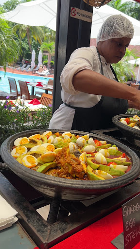 Fortunately, we were told that instead of eating inside we could eat outside by the pool which would have been okay if it were not so hot. The food looked and smelled very good, but we didn't stay to eat it. With a toddler, it was not going to be worth it. Instead we ordered some meat pies to go from the cafe (which were delicious!). Finally, the live all ladies band was a great touch, but as usual here in Accra, the sound was waaayyy too loud.