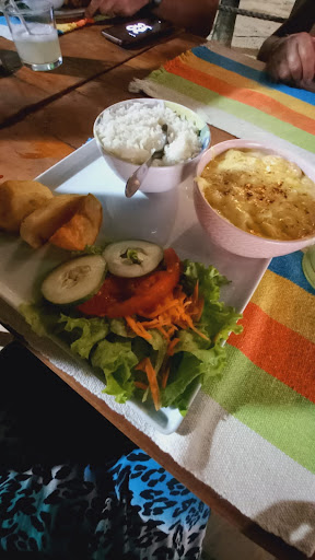 O atendente foi nos explicando cada prato do cardapio da rua * (é comum na Vila de Jeri eles deixarem uma lousa no chao com os principais pratos da casa) e foi tirando nossas duvidas. Bom, tudo que eu e meu marido pegamos estava MUITO, MAS MUITO BEM PREPARADO! MUITO BOM MESMO! Tem mtas opçoes com peixes e frutos do mar, o que é imprescindível quando turista de fora do nordeste procura em pratos de lá kkkk Pegamos um prato que vinha arroz, salada, batatas rusticas pra acompanhar e o principal: um delicioso escondidinho onde a base era banana + creme de camarão (com pedaçoes de camarão) finalizado com queijo gratinado! E serve bem! Da pra ver na foto que vem uma cumbuca cheia kkkk