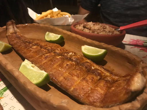 Como prato principal pedimos um peixe serra feito na brasa com molho branco de camarão. Como acompanhamento pedimos purê de abobrinha com arroz e fritas. Quando trouxeram o prato vimos que realmente era muito bem servido, haviam nos dito que atendia bem 3 pessoas mas acabou servindo muito bem eu, minha esposa e minha sogra.